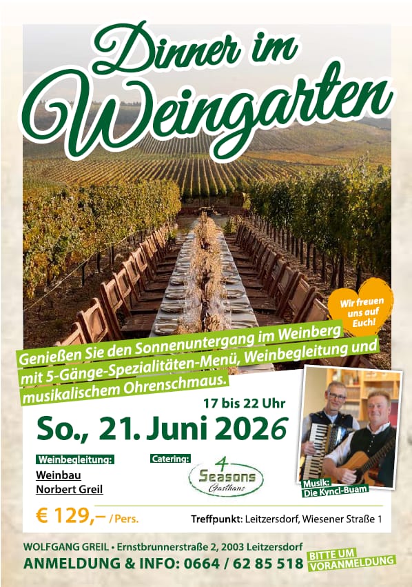 Datum: Sonntag, 21. Juni 2026 Uhrzeit: 17 bis 22 Uhr Preis: € 129,- pro Person Treffpunkt: Leitzersdorf, Wiesener Straße 1